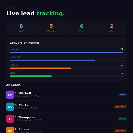 Full pipeline visibility from first enquiry to closed deal. Never lose a lead again.