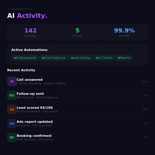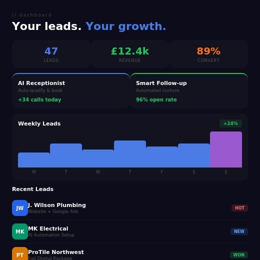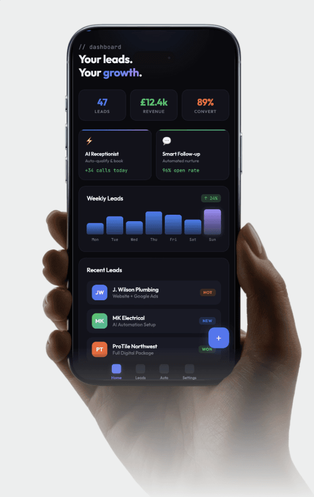 We design websites, build growth systems, run advertising campaigns, and develop AI automation that helps businesses capture and manage enquiries automatically.